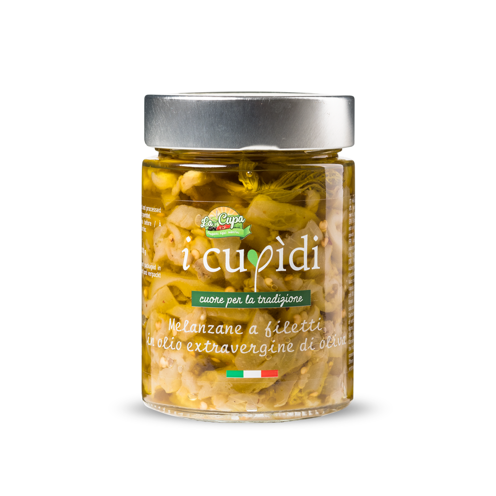 Melanzane a Filetti sottolio, selezione della migliore materia prima coltivata da aziende agricole locali e lavorazione interamente fatta a mano.
